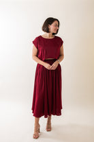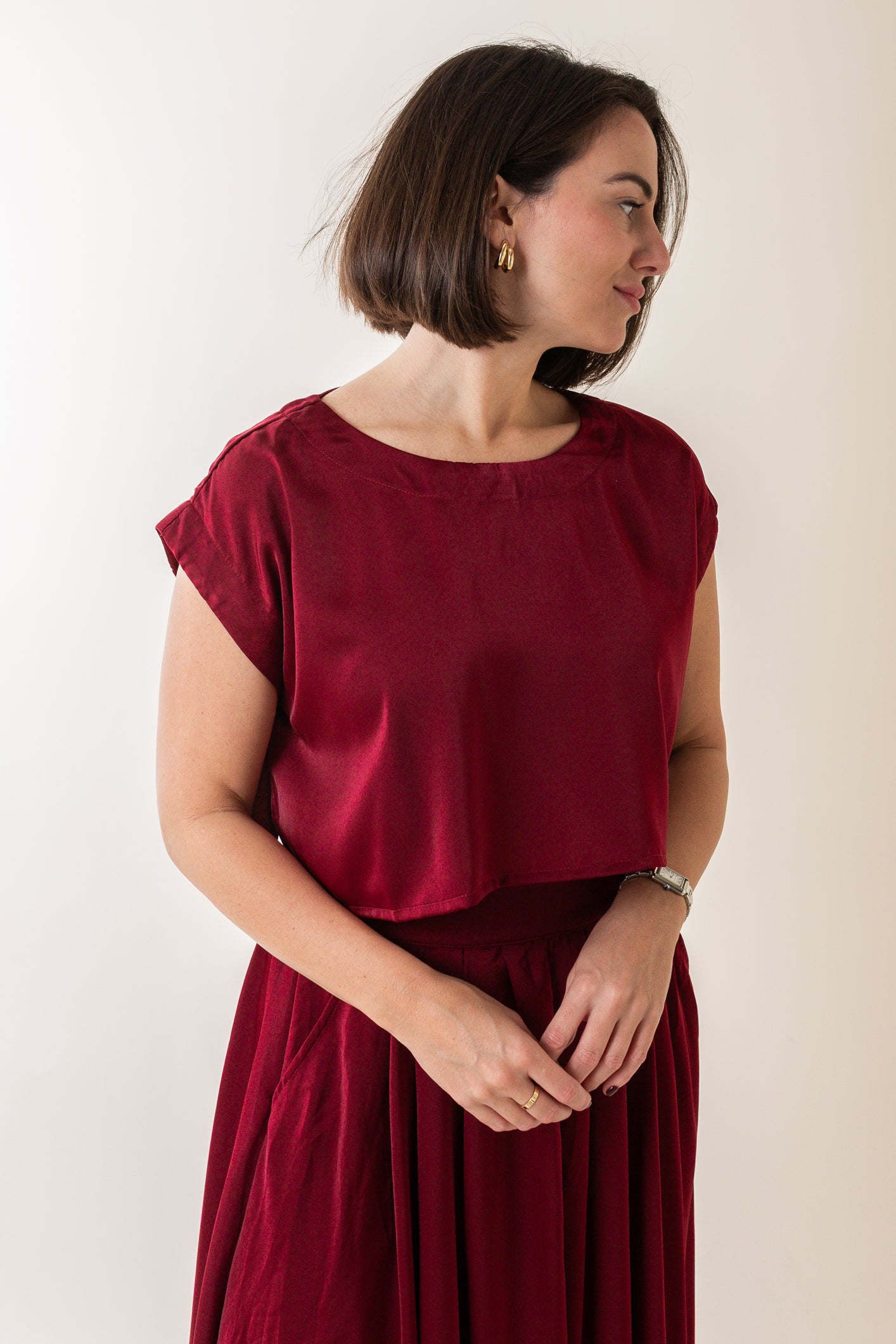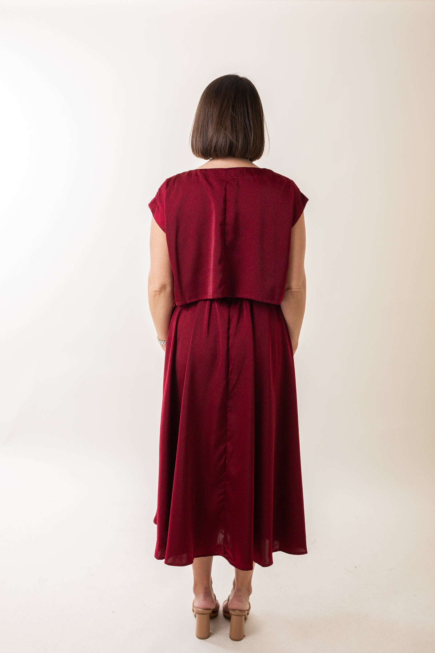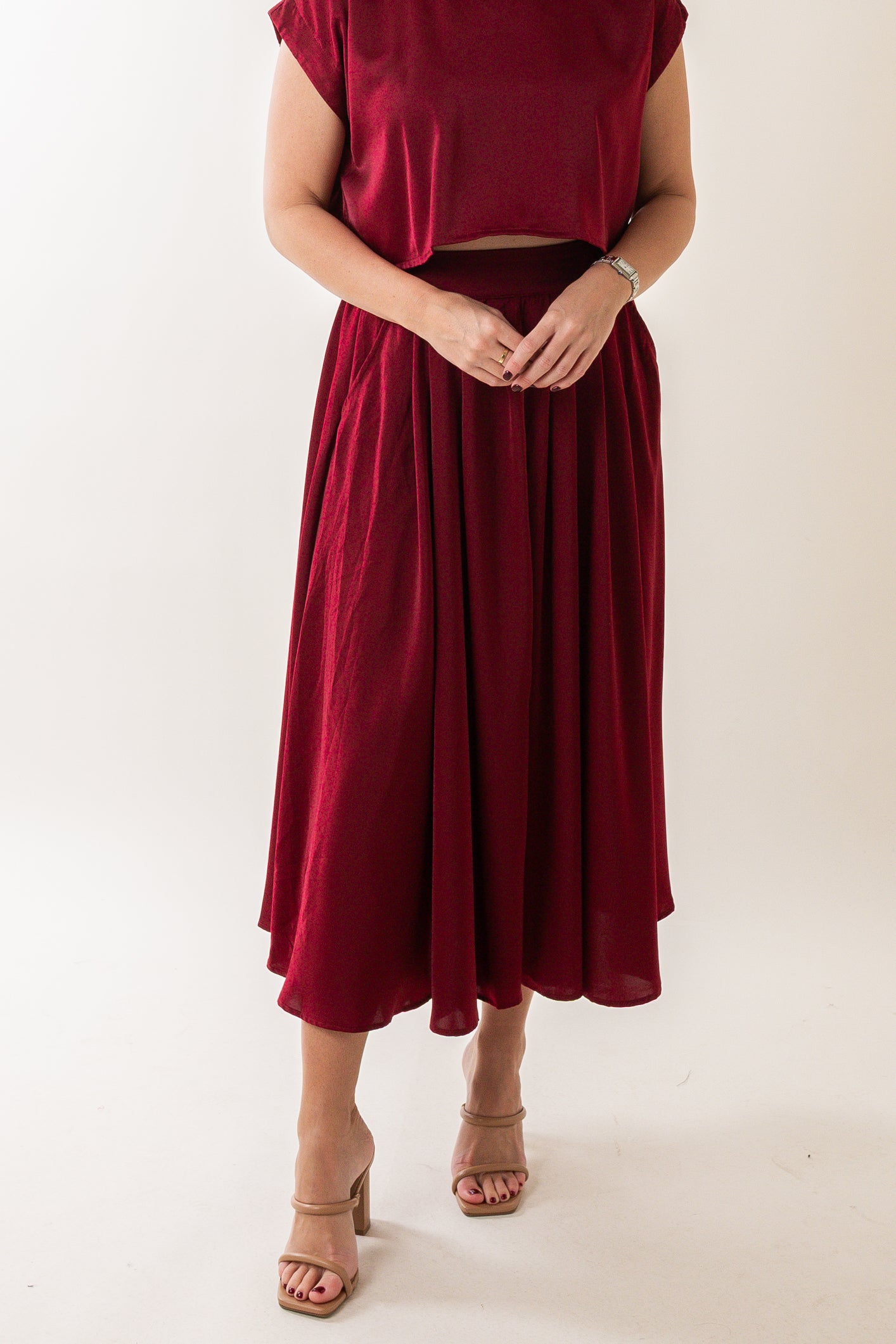 Satin Crop Top And Midi Skirt Set in Burgandy