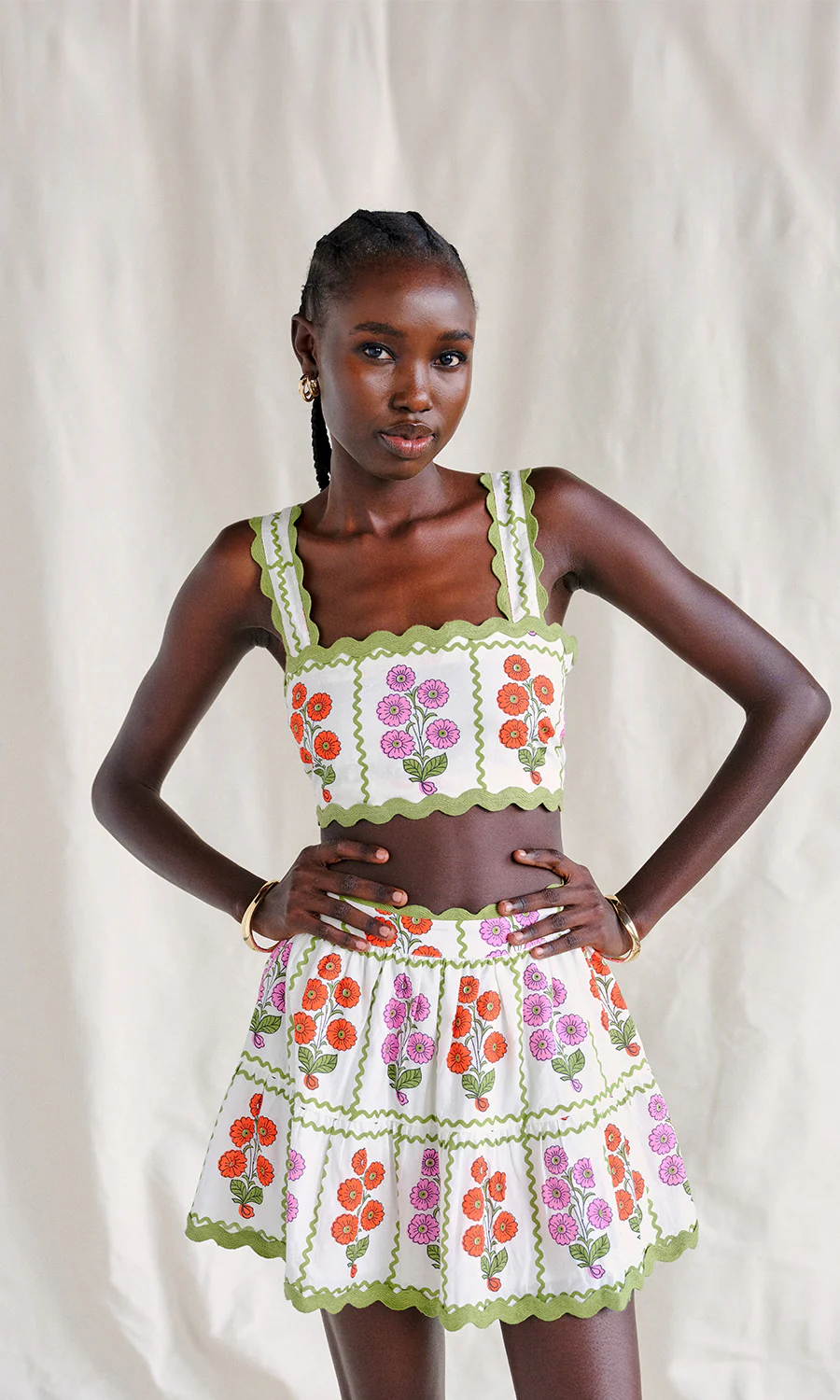 Our fan favorite Silas set is back and cuter than ever! This cotton two-piece set features a fitted bra top and matching mini skirt, both made from an adorable grid floral pattern ready for a picnic. The ricrac trim adds that perfect retro vibe, and the circle skirt adds a flirty appeal. Dress it up, dress it down, or just wear it to make people smile.