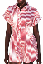 The Siobhan romper features dolman sleeves that give a beautiful silhouette, paired with a crisp collar, and button front. The stripe pattern adds visual interest, while cuffed sleeves keep things polished. Perfect for weekend adventures or casual days when you want to look put together without trying too hard.