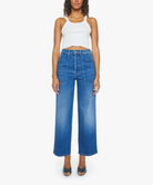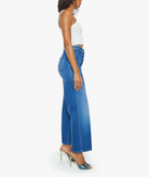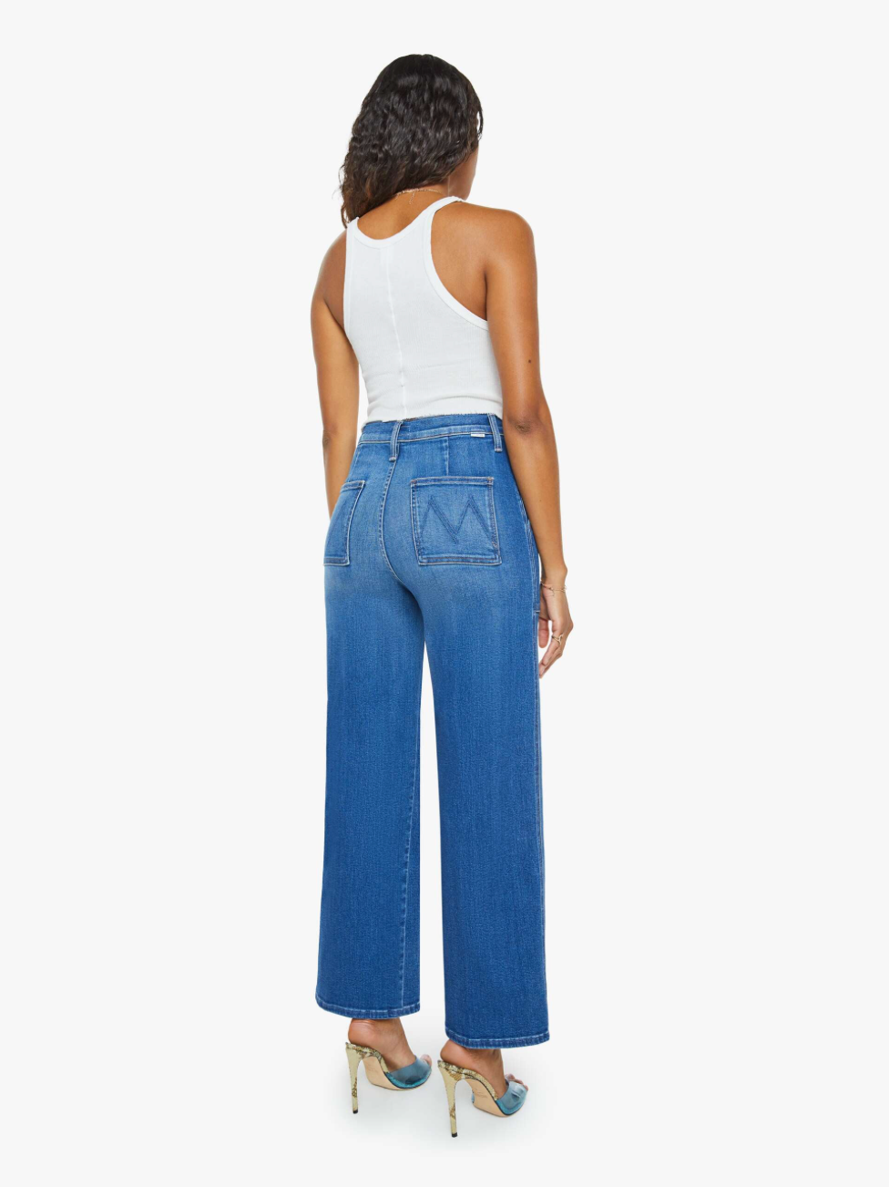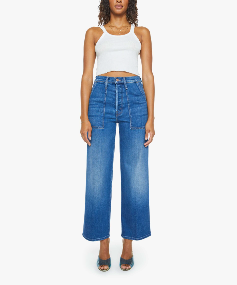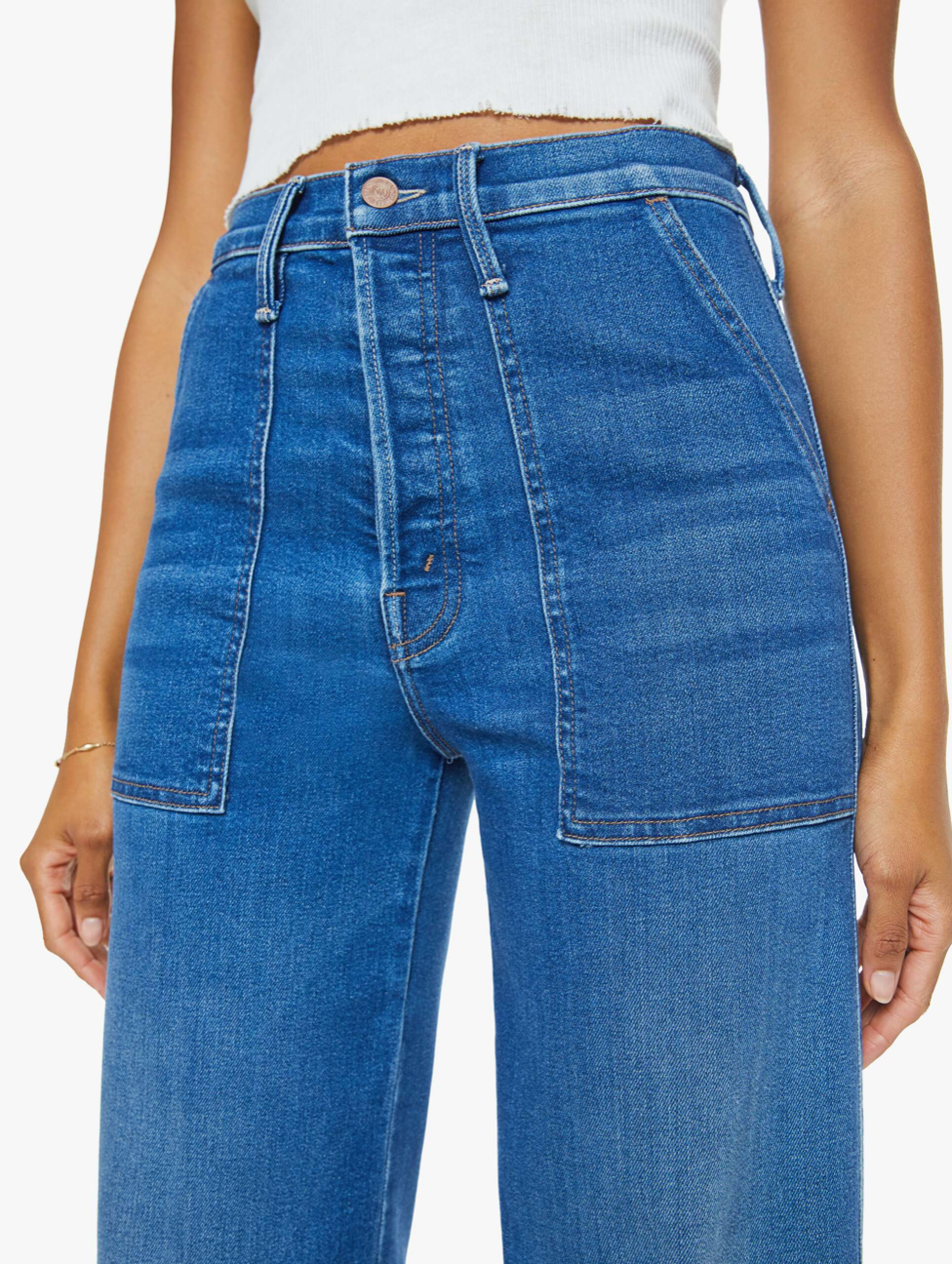 Cut it out. Super high-rise jeans with a loose fit, wide leg, button-fly, patch pockets and 29-inch inseam with a clean hem. Crafted from soft stretch denim, Nip It In The Bud is a mid-blue with subtle fading and whiskering.