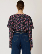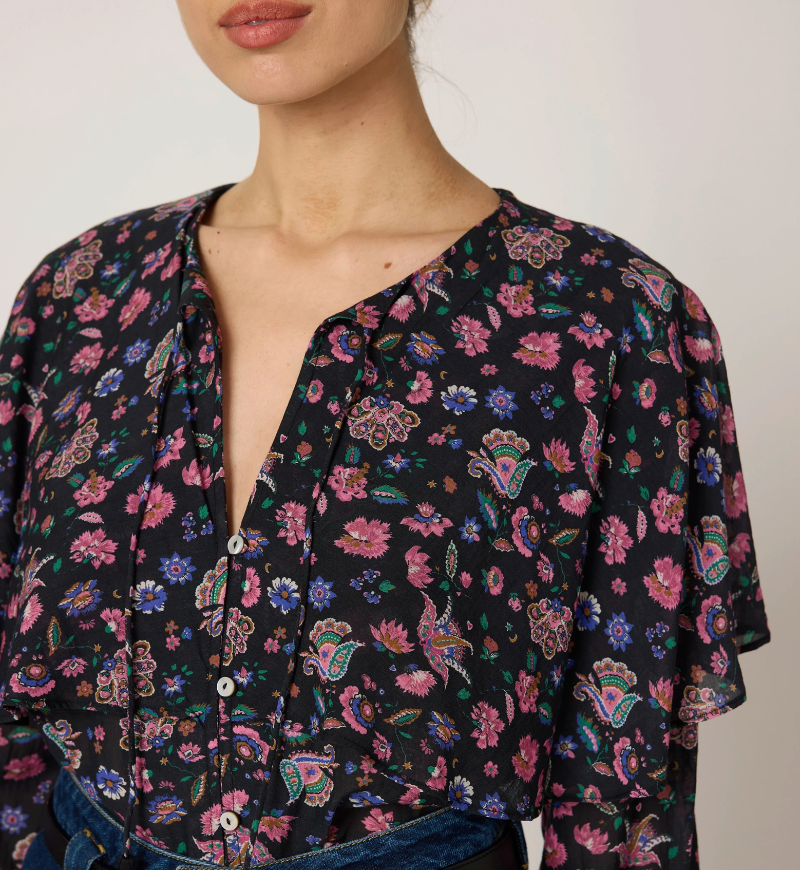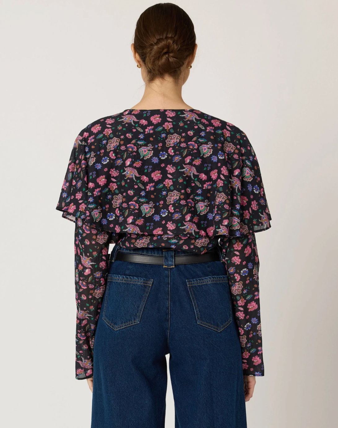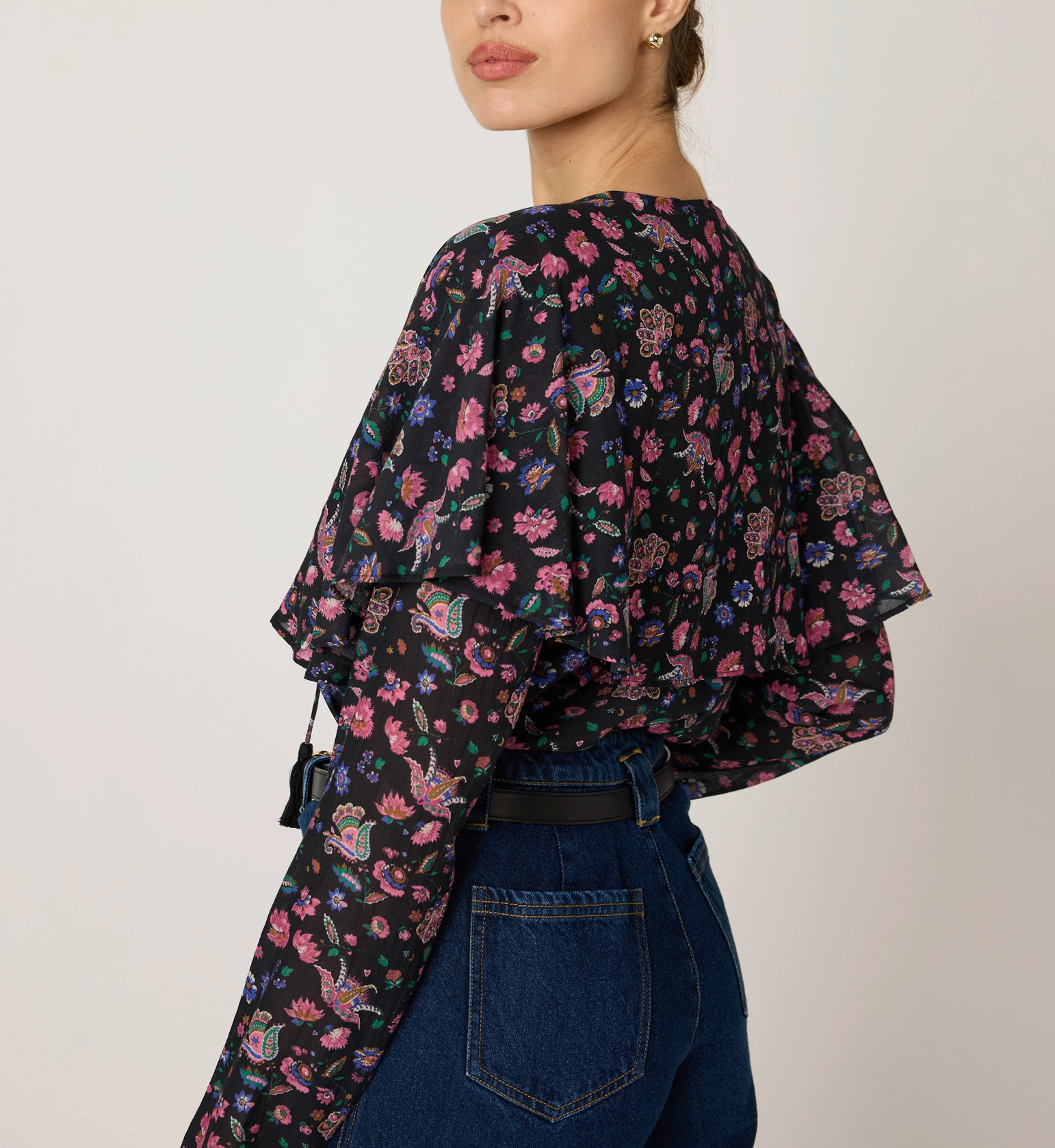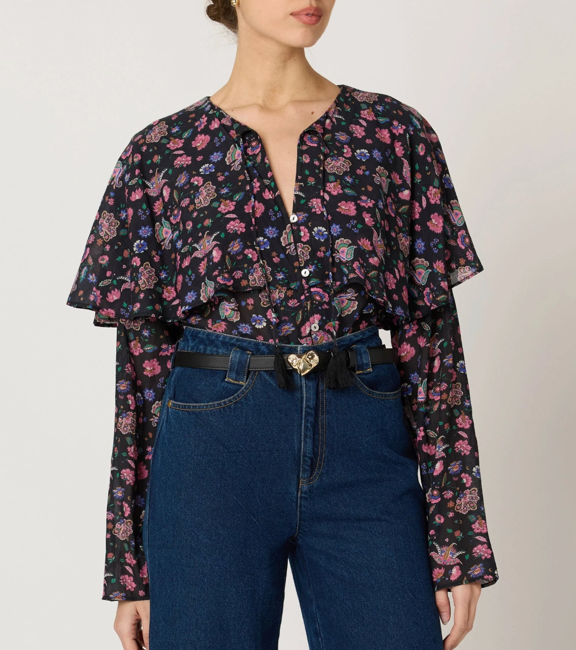 Ethically handmade in India, the Tyra Blouse features a delicate button-down front, romantic flutter sleeves, and a vibrant hand-drawn floral print set against a dark base for a striking contrast. Crafted from a lightweight, breathable cotton-viscose blend, this blouse transitions seamlessly from day to night — perfect for pairing with denim or tailoring for a refined yet playful look.