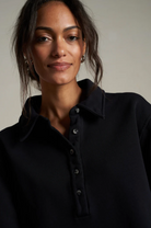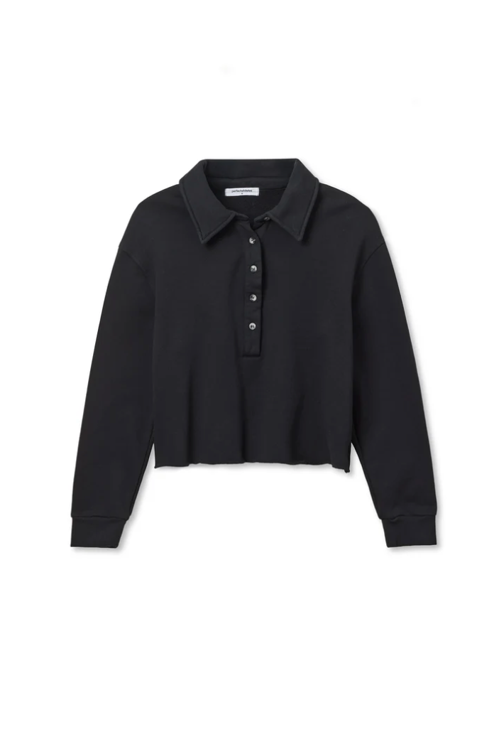 the vinny top is crafted from heavy fleece and finished with a raw hem for a relaxed, lived-in look. designed with a collared neckline and button placket, it brings a polished touch to a casual silhouette.